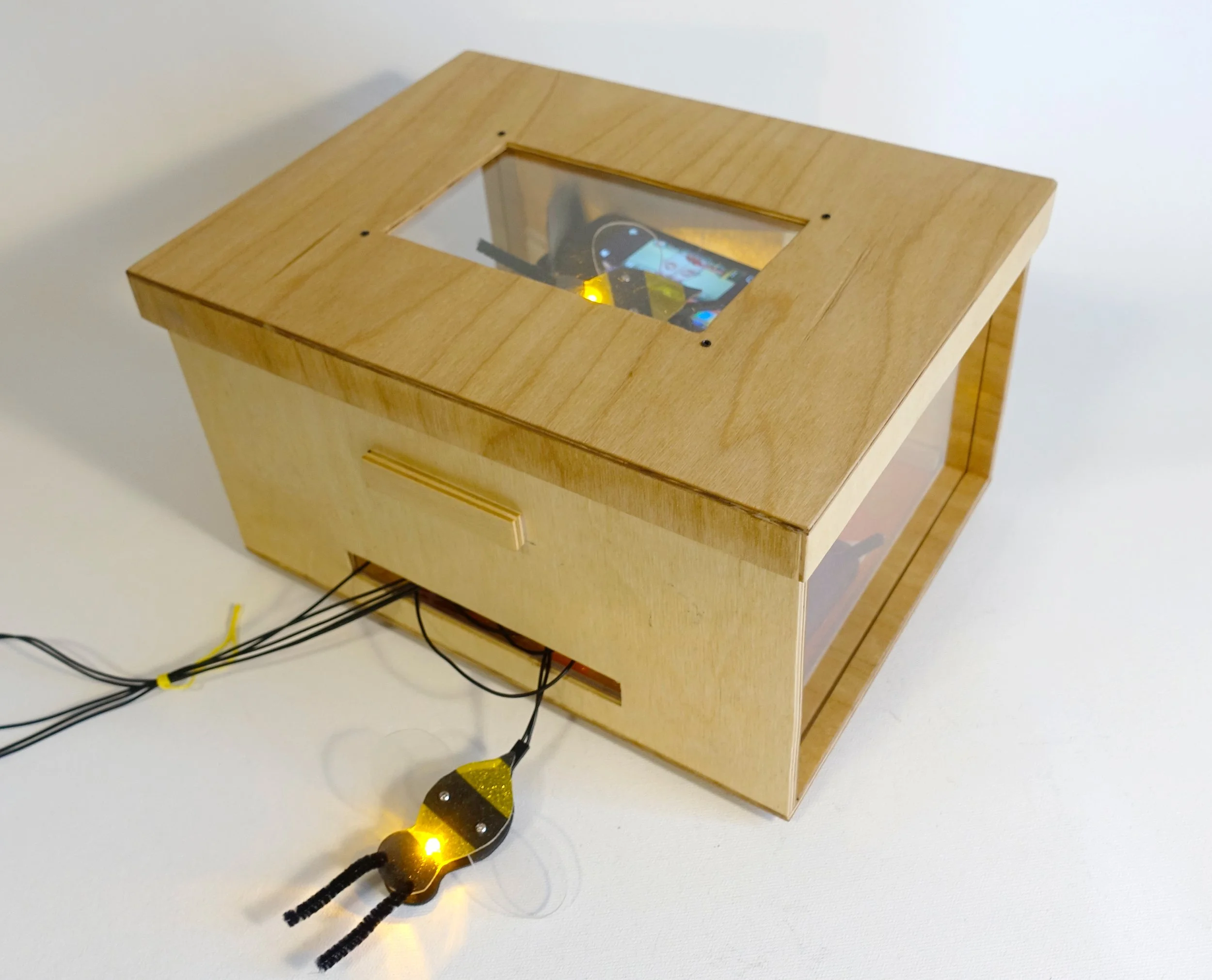 Technical details: Three sensors disguised as bees (vibration sensor, accelerometer and ultrasonic sensor). Beehive shaped box (29 x 21.5 x 16 cm), microcontroller, servo motor, DC motor with two velostat strips to scroll the mobile phone touch screen, motor driver, a lighting system, mobile phones, and power bank.
